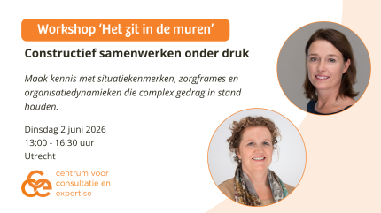 In de workshop 'Het zit in de muren' maak je kennis met situatiekenmerken, zorgframes en organisatiedynamieken die gedrag dat als problematisch wordt ervaren in stand houden of zelfs versterken. Ook maken we een aanzet tot leren denken en werken vanuit deze context.